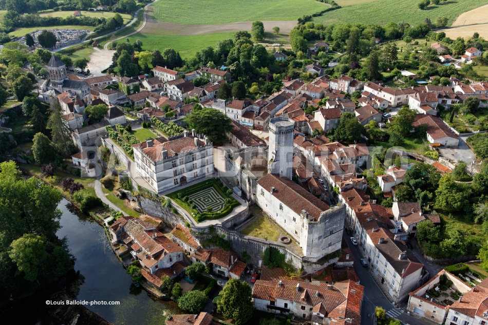 Bourdeilles et son château, orné de jardins et terrasses, dominant la vallée de la Dronne.