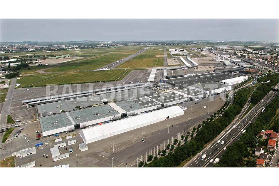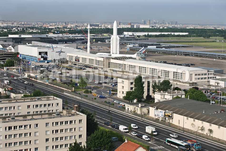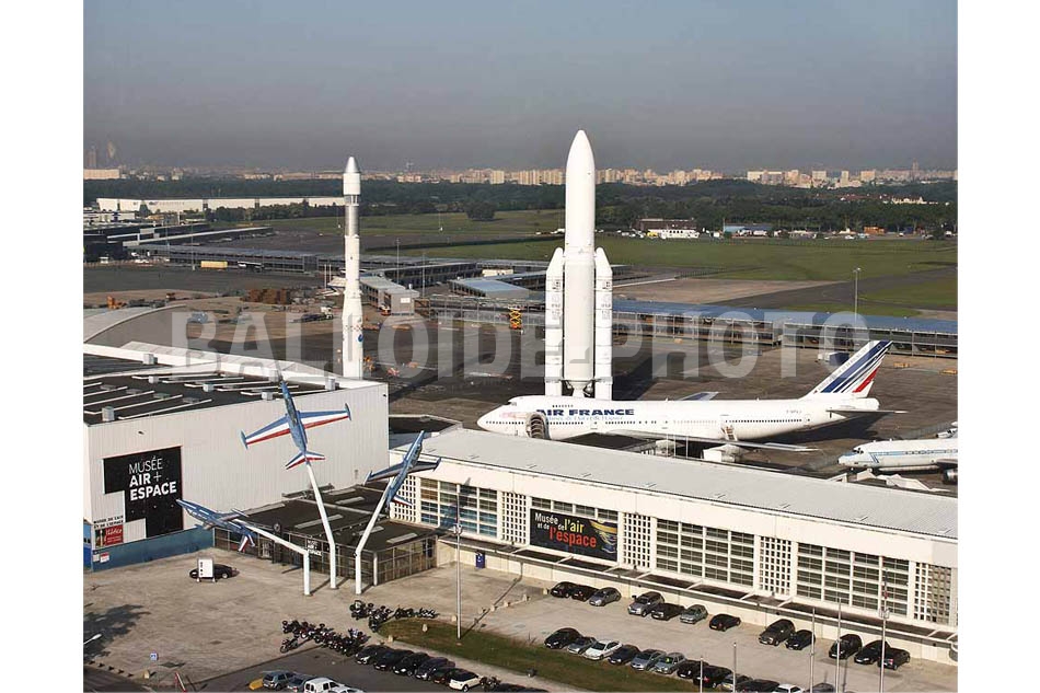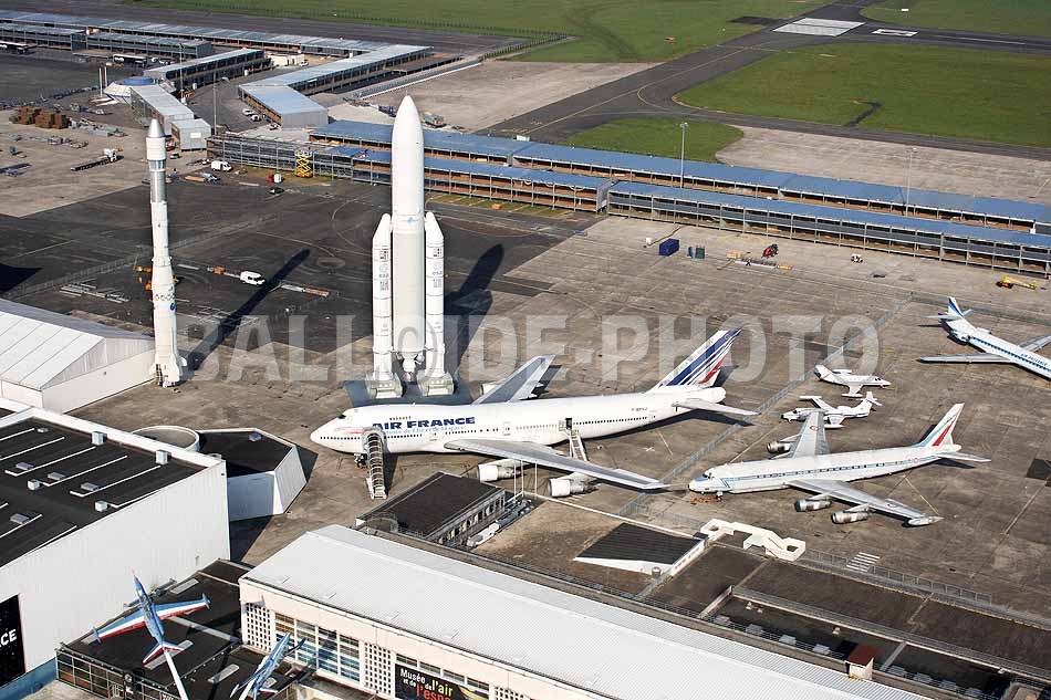 Les vues aériennes ont été réalisées en avec un ballon captif pour le réaménagement du site. Nous en avons profité pour photographier les maquettes en grandeur réelle des fusées Ariane 1 et Ariane 5 dominant un Boeing 747.