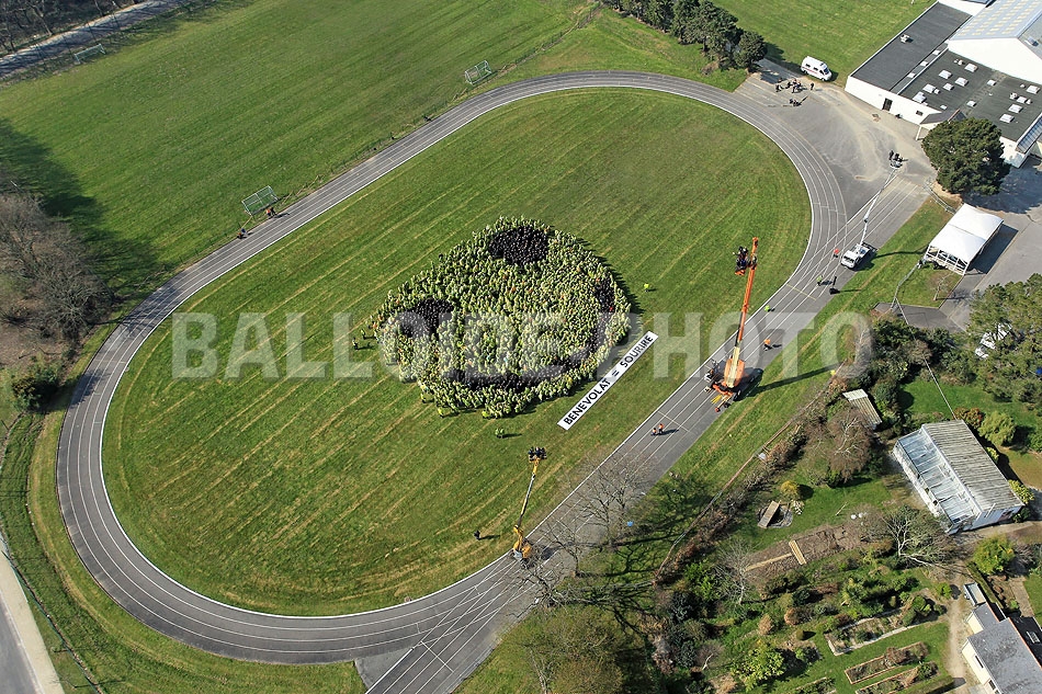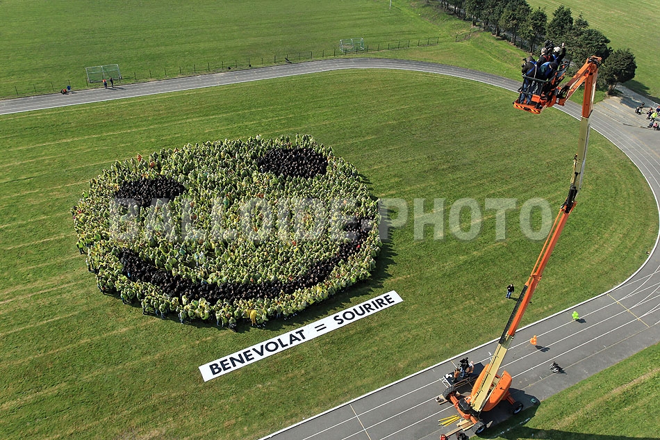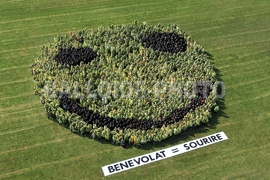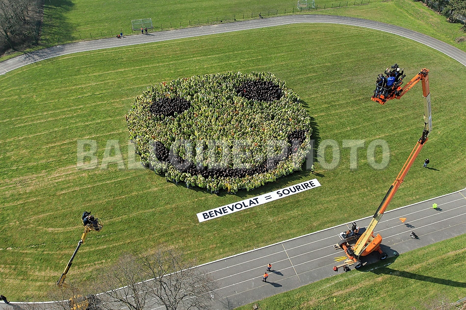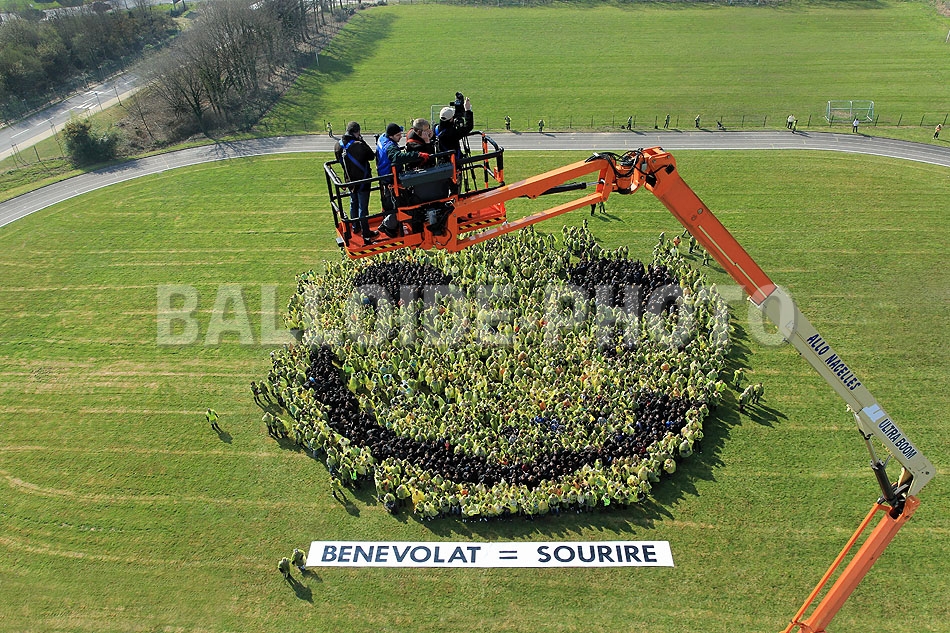 En ce début de printemps qui, du côté de la météo n'en est pas un, tous ces jeunes ont décidé de donner un emblème au bénévolat, celui du sourire... et cela ne pouvait que leur porter bonheur, puisqu'en ce 28 mars les brumes, les pluies, les vents ont (momentanément) disparu pour laisser la place au soleil et rendre encore plus photogénique, vu du ciel, ce SOURIRE GEANT et JOYEUX.