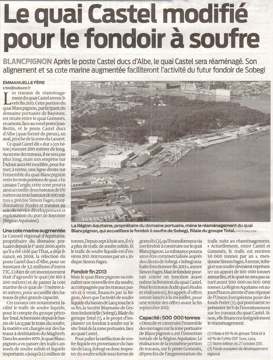 Dans cet article du 03/07/2012 paru dans le Journal Sud-Ouest, sont evoqués les travaux concernant le Quai Castel et la zone dite du Souffre du Port de Bayonne. Article illustré par un cliché réalisé par nos soins lors du reportage de l'ensemble du Port de Bayonne pour le Conseil Régional en 2010